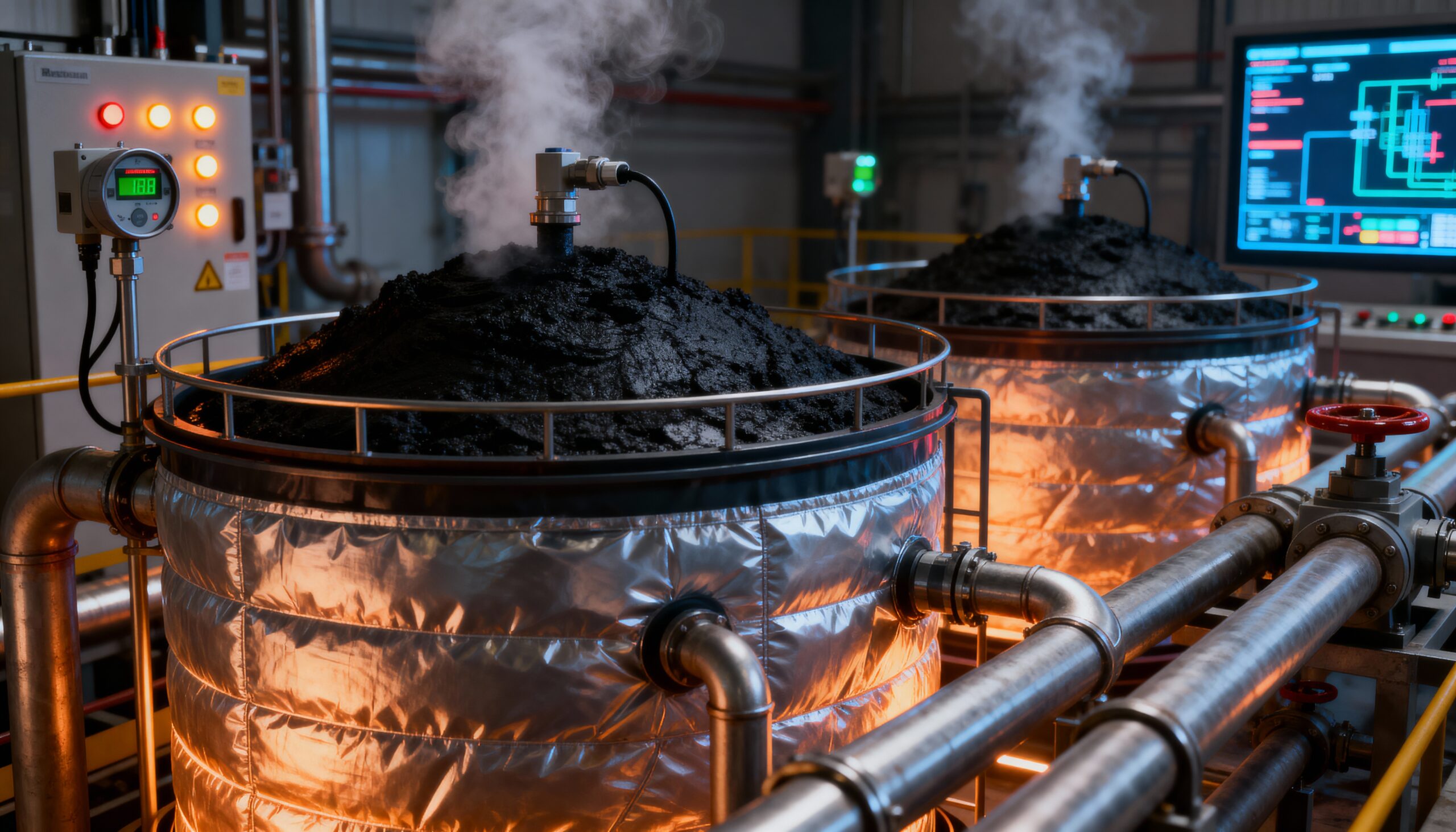Bitüm stok tanklarında sıcaklık, seviye ve akış kontrolünü tam otomatik hale getirerek güvenli ve verimli bir depolama süreci sağlıyoruz. Geliştirdiğimiz otomasyon sistemleri; tank sıcaklığını hassas sensörlerle ölçer, ısıtıcıları otomatik olarak yönetir ve operatöre anlık veriler sunar.
